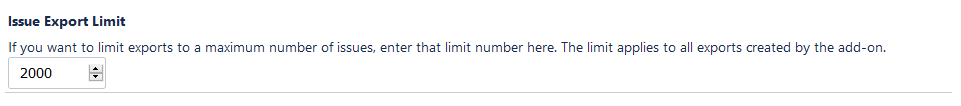 This section allows an administrator to set a limit on the number of issues that can be exported at one time. Since larger exports take more time and resources to generate and update, limiting the number of issues in the exports can help improve performance. The default limit is 1,000 in Jira Cloud. To allow an unlimited number of issues, set this value to -1. Any limit set here applies to all exports created by the add-on.