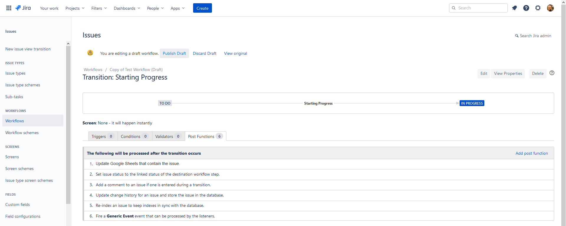 Administrators may want to trigger export updates only when certain workflow transitions occur, instead of triggering updates every time an issue is created or edited. The add-on exposes a workflow transition post function to accomplish this goal. Since issue fields are typically edited during workflow transitions, we recommend you carefully consider your configuration of workflow transition post functions and how they may overlap with configured webhooks, since they present the possibility of firing multiple update events for a single change.