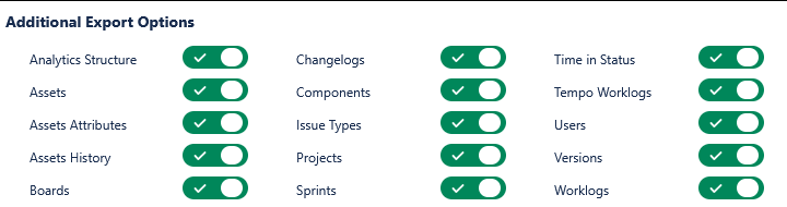 This section allows an administrator to expose additional data export options for users to select on the Export screen. If any options are enabled here, an "Additional Export Data" item will appear on the Export screen, giving the user the option to export additional data to other tables in the selected namespace. Currently there are 15 additional export options available, with 14 of these options being configurable by a Jira administrator. Some options, such as Tempo Worklogs, are only available when the developer's app is installed and active.