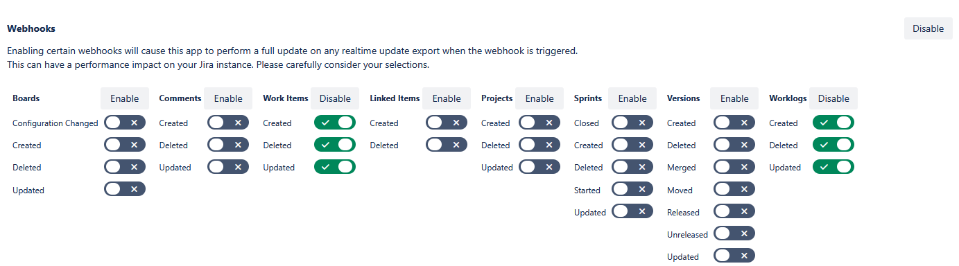 This section of the Configuration screen allows an administrator to toggle which Jira events will trigger updates to real-time update exports. By default, only issue- and worklog-related events are enabled. Most administrators find that the default configuration meets their needs, but there are cases where you may want to enable other webhooks. For instance, if you have an export that should update when a sprint is closed, an administrator would enable the "Sprint Closed" webhook so that your export is updated when the sprint is closed. It is also possible to disable all webhooks if you need to quickly stop updates to all of your exports.