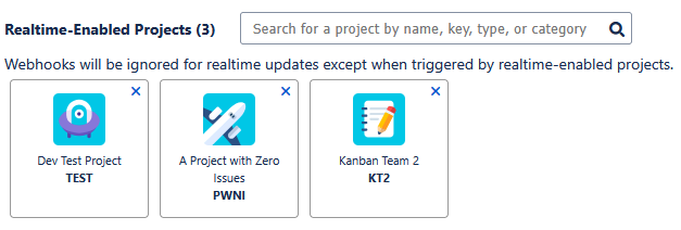 This section allows an administrator to define which projects' Jira events will trigger updates to real-time update exports. By default, every project is enabled. Administrators may find that some projects do not need to update exports, and disabling those projects here may provide a performance benefit. Jira events fired from issues in projects that are not enabled here, will be ignored. Note that this section and the Jira App Configuration#Webhooks section work together; the add-on will only process enabled events on realtime-enabled projects. Users are still able to export issues from projects that are not enabled here, but changes to issues in those projects will not trigger real-time updates, even if the export itself is realtime-enabled.