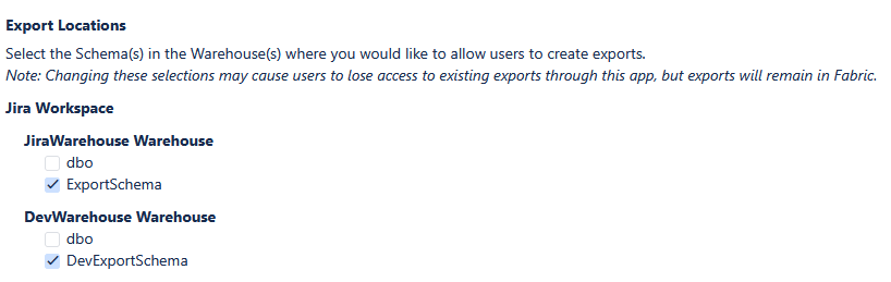 This section allows an administrator to define Fabric locations where users can store their exports. For each workspace in the list, check the checkbox for the warehouse(s) and schema(s) were you would like to allow users to store exports.