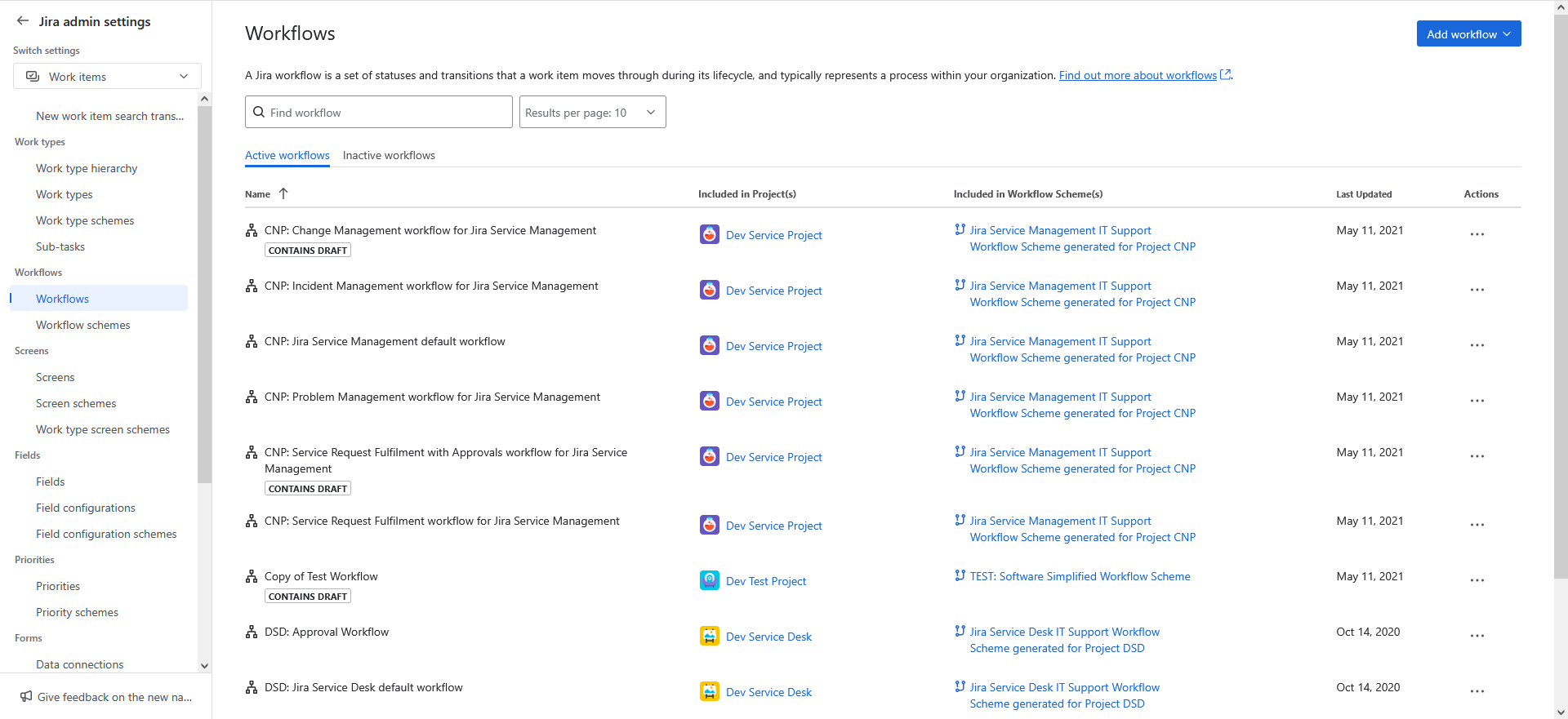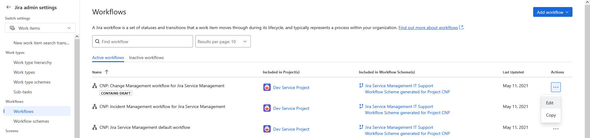 Find the workflow you want to configure, click the Actions menu for that workflow, and select Edit.
