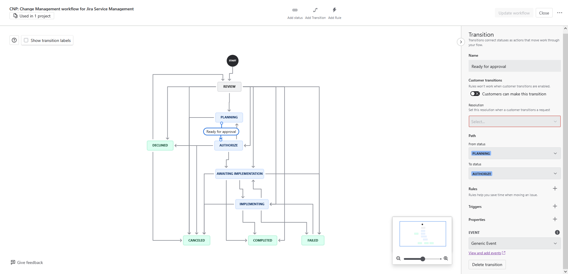 In the workflow edit screen, find the transition you want to configure, and click the transition's name.