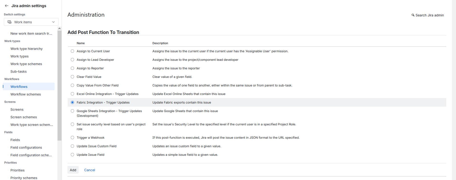 Find the Fabric Integration - Trigger Updates post function, and tick the radio button next to it, then click Add.