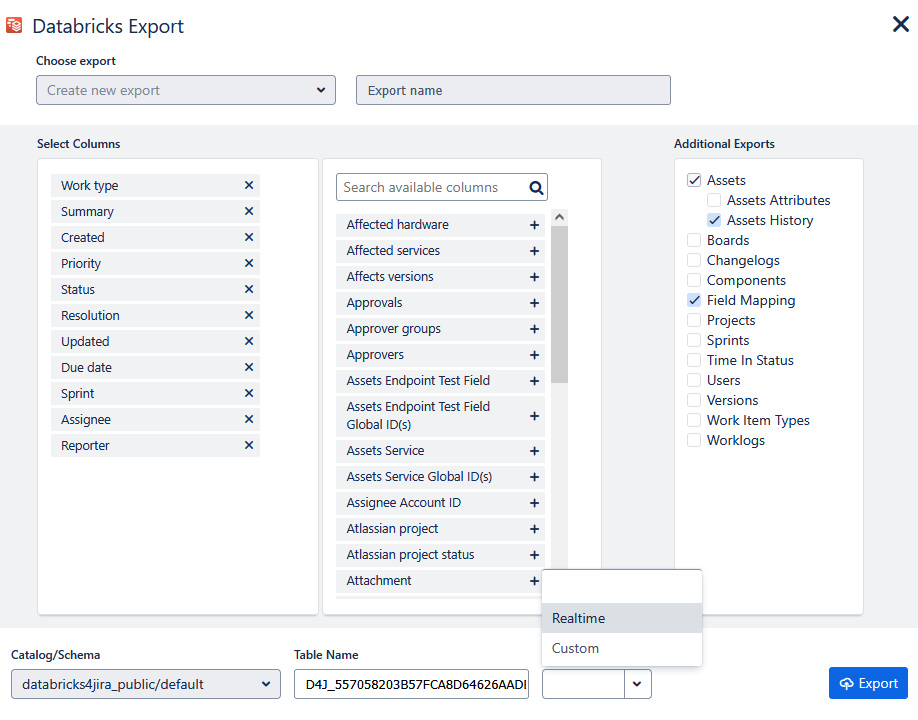 If configured, you can choose to include additional Jira data related to your export when sending data to Databricks. Toggle the checkboxes in the Additional Exports section as needed. Note that a Jira administrator can configure which options are present in this section, so your options may differ from the image below.