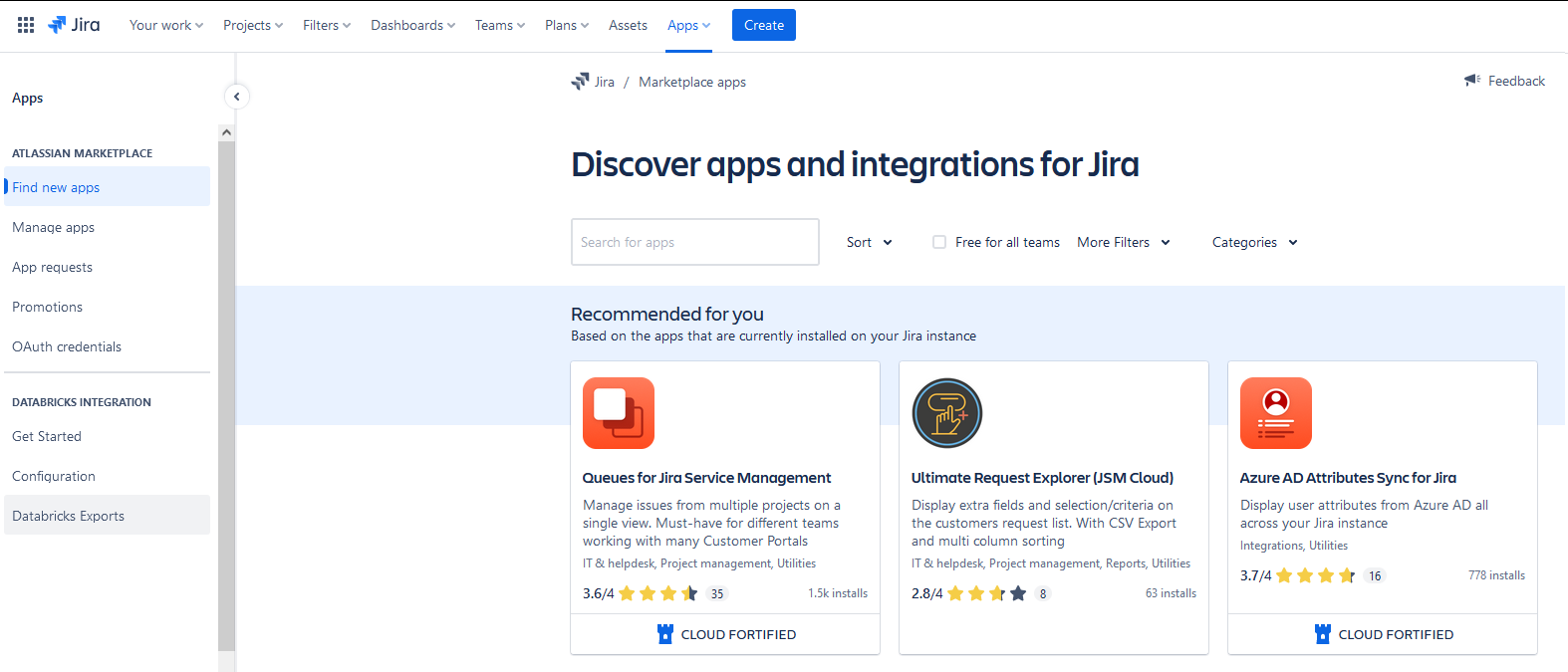To access the Databricks Exports screen, navigate to the Jira apps administration section in your Jira instance, and on the left side you will find the Databricks Exports link under a Databricks Integration heading.
