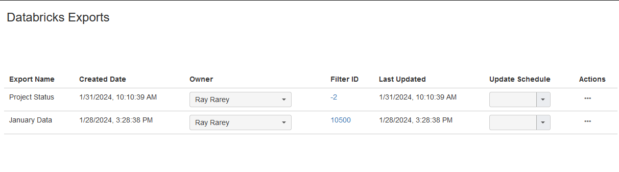 From the Databricks Exports screen, Jira administrators can perform the following actions on the exports: