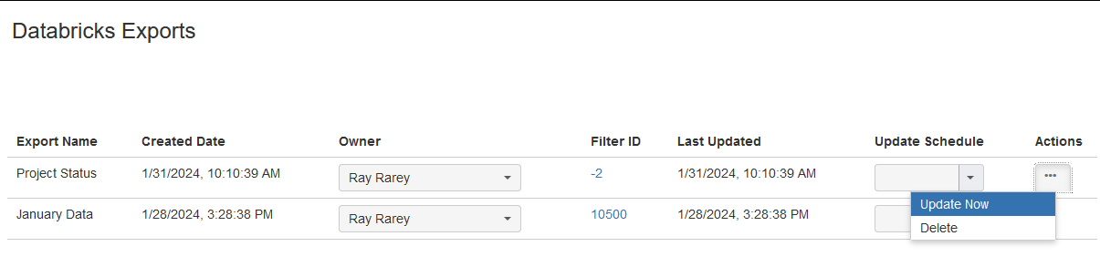 Sometimes it is necessary to refresh all of the Jira issue data in an export. To do this from the Databricks Exports screen, simply click the Actions button for the export you wish to update, then choose Update Now from the Actions menu. Updating all issue data in a export sometimes takes a while, so please be patient. Once the process is complete, a success dialog will appear on the screen, and the export's Last Updated column value will change to reflect the recent update.