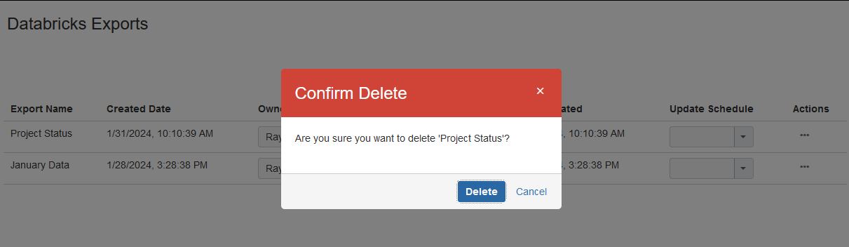 The Databricks Exports screen allows a Jira administrator to easily delete an export. Simply click the Actions button for the export you wish to remove, then choose Delete from the Actions menu, and confirm your request.