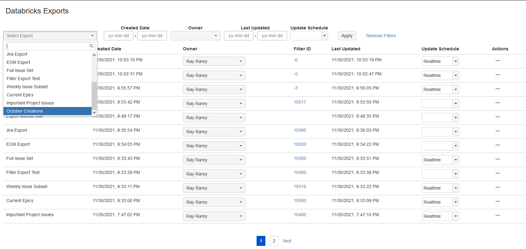 To change an export's Jira owner from the Databricks Exports screen, click on the owner drop down and choose a new owner from the user picker. Changes to export owners take effect immediately. This controls which user can see the export on the Export screen in the Update Existing Export drop down.