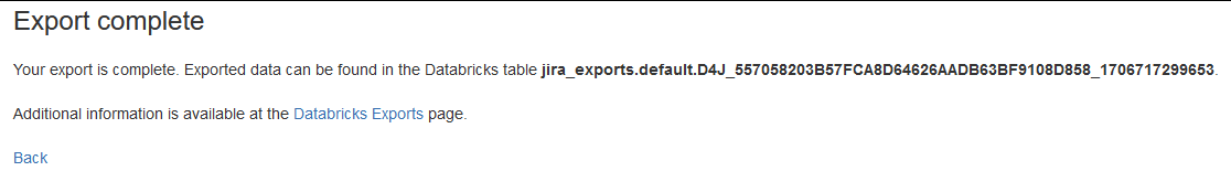 When your export is complete, you will be presented with a screen showing the location of your export and linking you to additional information on the Databricks Exports screen.