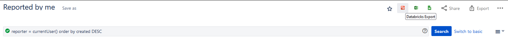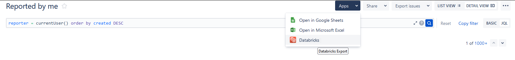 Note: If you cannot find the Databricks Export action icon at the top right of the Issue Navigator screen, you may be using a newer Issue Navigator view. Check for the Databricks item in the Apps dropdown, if present: