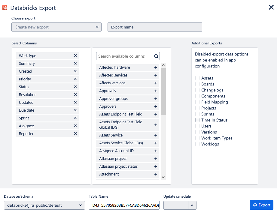 Select the standard and custom fields that you want to export, provide an export name, select an optional update schedule, choose any additional export data you'd like to include, an optional catalog, schema, and export table name, and click the Export button.