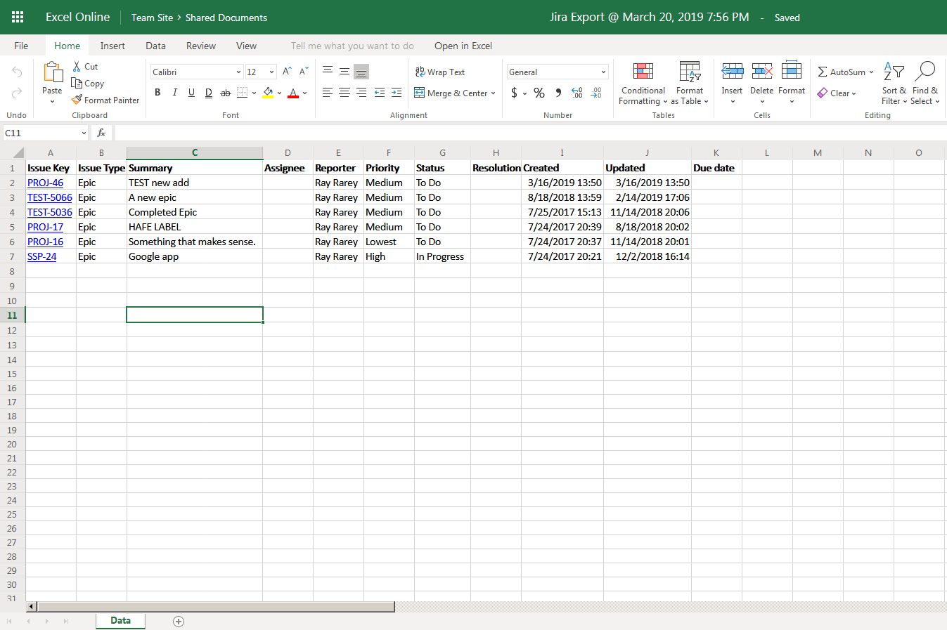 When you create a Jira issue export using the add-on, the result is a rather plain looking spreadsheet, similar to what you see below.