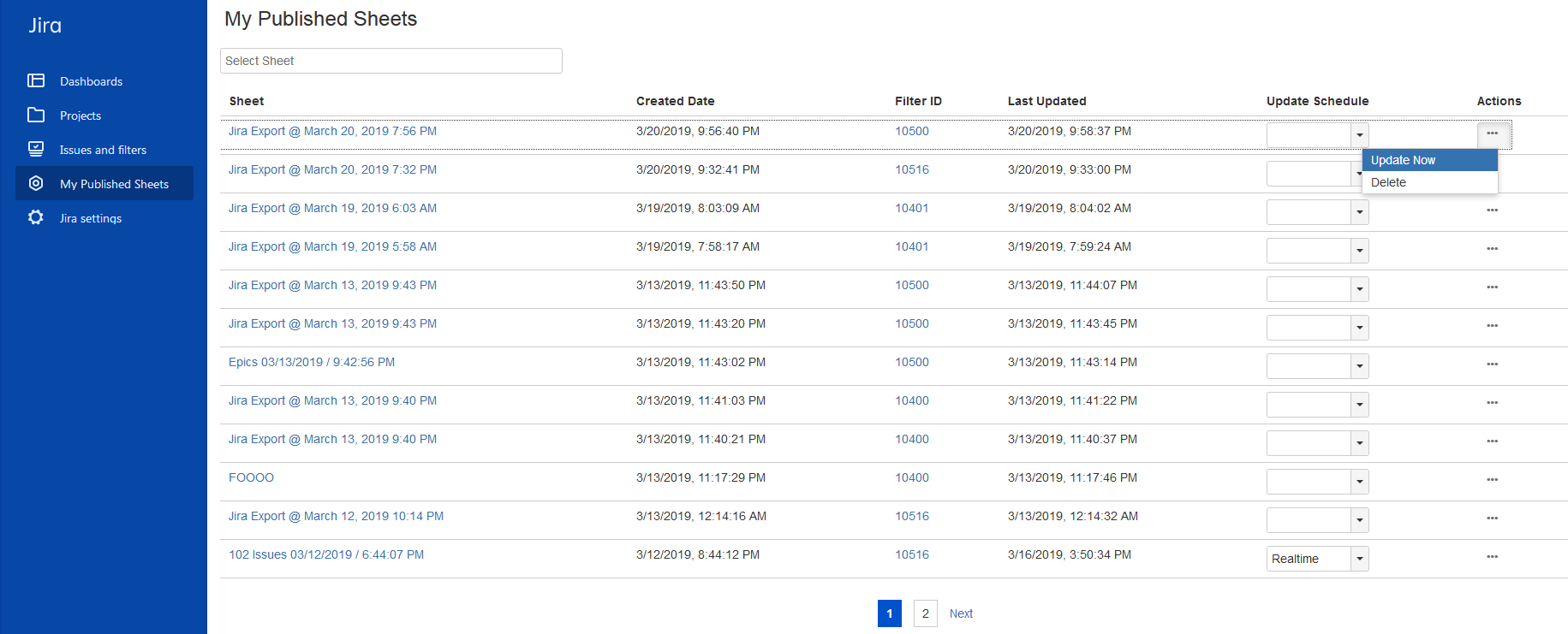 Sometimes it is necessary to refresh all of the Jira issue data in a sheet. To do this from the My Published Excel Sheets screen, simply click the Actions button for the sheet you wish to update, then choose Update Now from the Actions menu. Updating all issue data in a sheet sometimes takes a while, so please be patient. Once the process is complete, a success dialog will appear on the screen, and the sheet's Last Updated column value will change to reflect the recent update.
