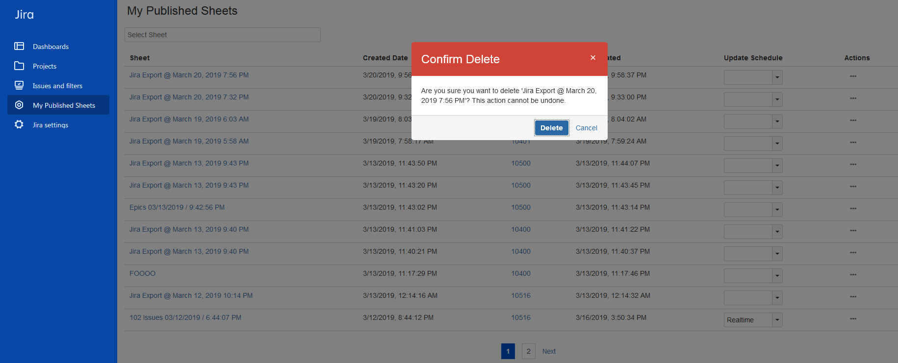 Since a sheet may be stored in a location not easily accessible from Google Drive, the My Published Excel Sheets screen allows a Jira user to easily delete a sheet. Simply click the Actions button for the sheet you wish to remove, then choose Delete from the Actions menu, and confirm your request. Deleted sheets cannot be recovered, so be absolutely sure you want to delete the sheet before continuing.