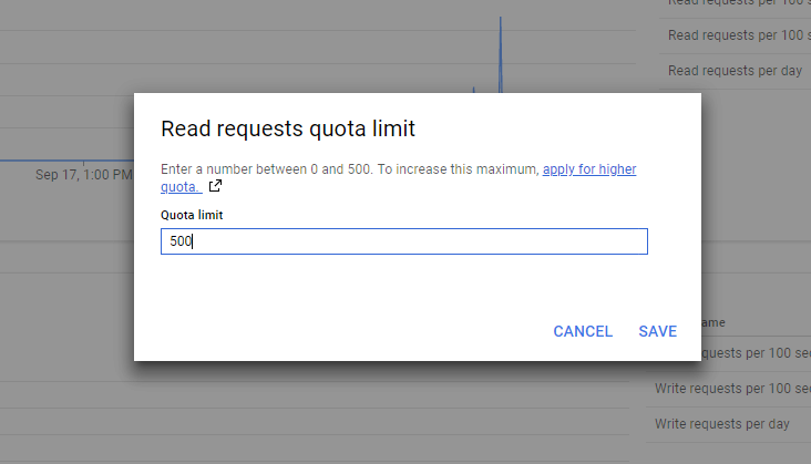 - After examining each of these graphs, click on the pencil icon next to the Read requests per 100 seconds, Read requests per 100 seconds per user, Write requests per 100 seconds, and/or Write requets per 100 seconds per user to set higher quotas. Use the peaks of the graphs from steps 2 and 3 to help you determine what an appropriate quota might be.