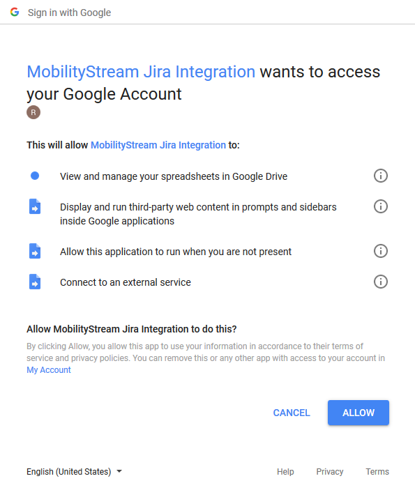 After clicking the Allow button, the add-on is installed and accessible from within Google Sheets via the Add-ons menu as the "Mobility Stream Jira Integration" item.