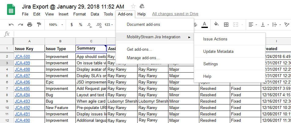 Now that installation is complete, continue to the Using Google Add-on page for more information about how to use the add-on. For more information on the field types that can be synced from Google Sheets to Jira, see the Google Sheets Synchronization - Supported Field Types page.