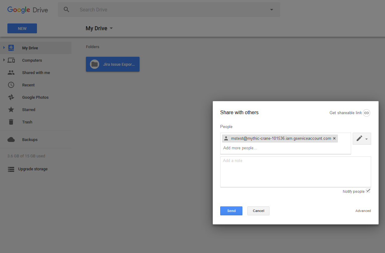 After entering your Service Account's email address, click the Send button. Repeat this process for all folders you want to use for storing exports.