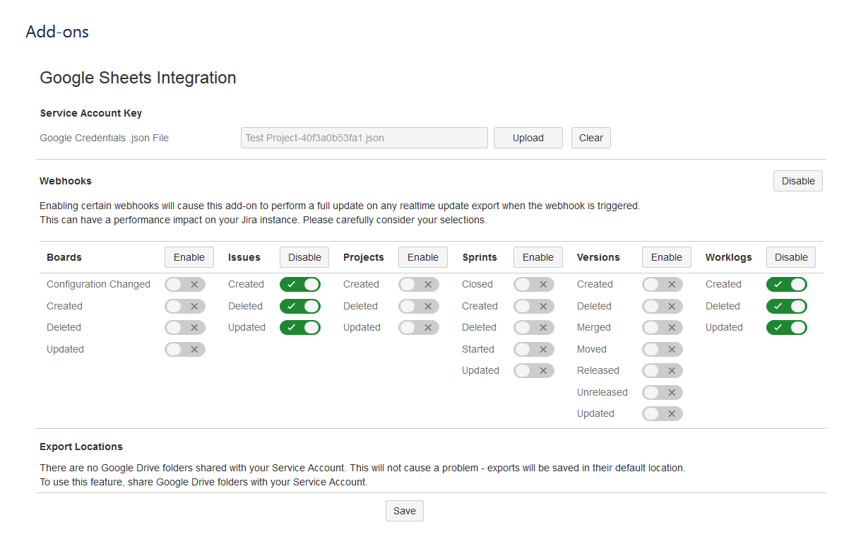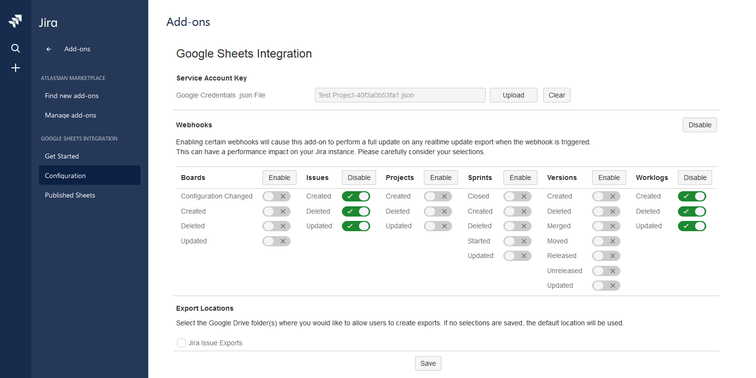 This section of the Configuration screen allows an administrator to toggle which Jira events will trigger updates to real-time update Google Sheets. By default, only issue- and worklog-related events are enabled. Most administrators find that the default configuration meets their needs, but there are cases where you may want to enable other webhooks. For instance, if you have an export that should update when a sprint is closed, an administrator would enable the "Sprint Closed" webhook so that your export is updated when the sprint is closed. It is also possible to disable all webhooks if you need to quickly stop updates to all of your sheets.