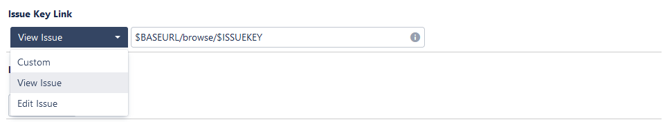 This section allows an administrator to define the hyperlink for issue keys displayed in exports. The default value is View Issue, so that clicking on an issue key in an export will take the user to that issue's View Issue screen in Jira. An administrator can choose the alternative Edit Issue option to load the Edit Issue screen in Jira, or define a custom hyperlink.