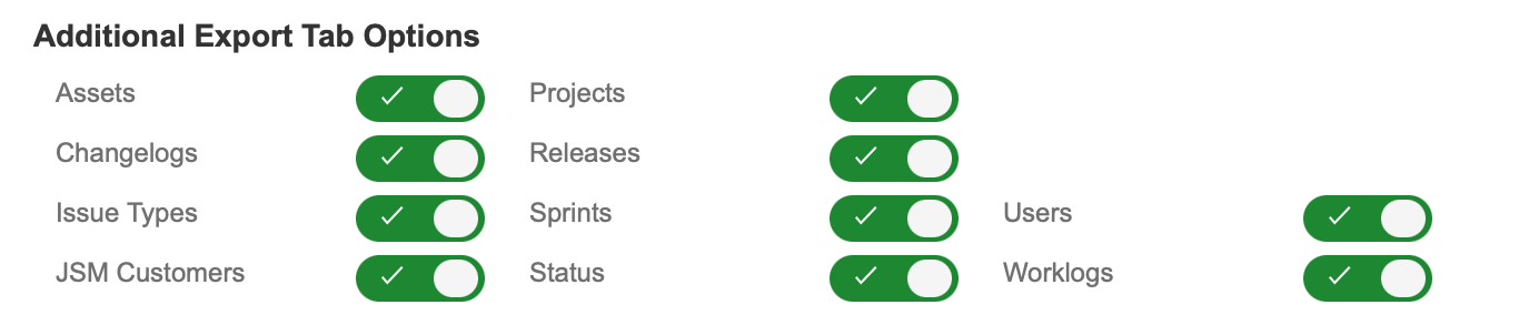 This section allows an administrator to expose additional data export options for users to select on the Export screen. If any options are enabled here, a "Additional Export Tabs" item will appear on the Export screen, giving the user the option to export additional data to their sheet.