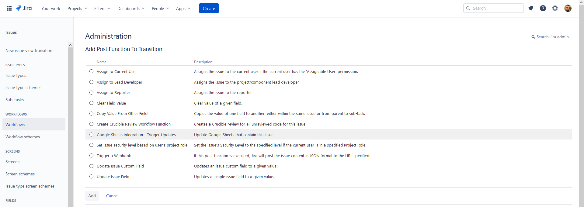 Administrators may want to trigger sheet updates only when certain workflow transitions occur, instead of triggering updates every time an issue is created or edited. The add-on exposes a workflow transition post function to accomplish this goal. Since issue fields are typically edited during workflow transitions, we recommend you carefully consider your configuration of workflow transition post functions and how they may overlap with configured webhooks, since they present the possibility of firing multiple update events for a single change.