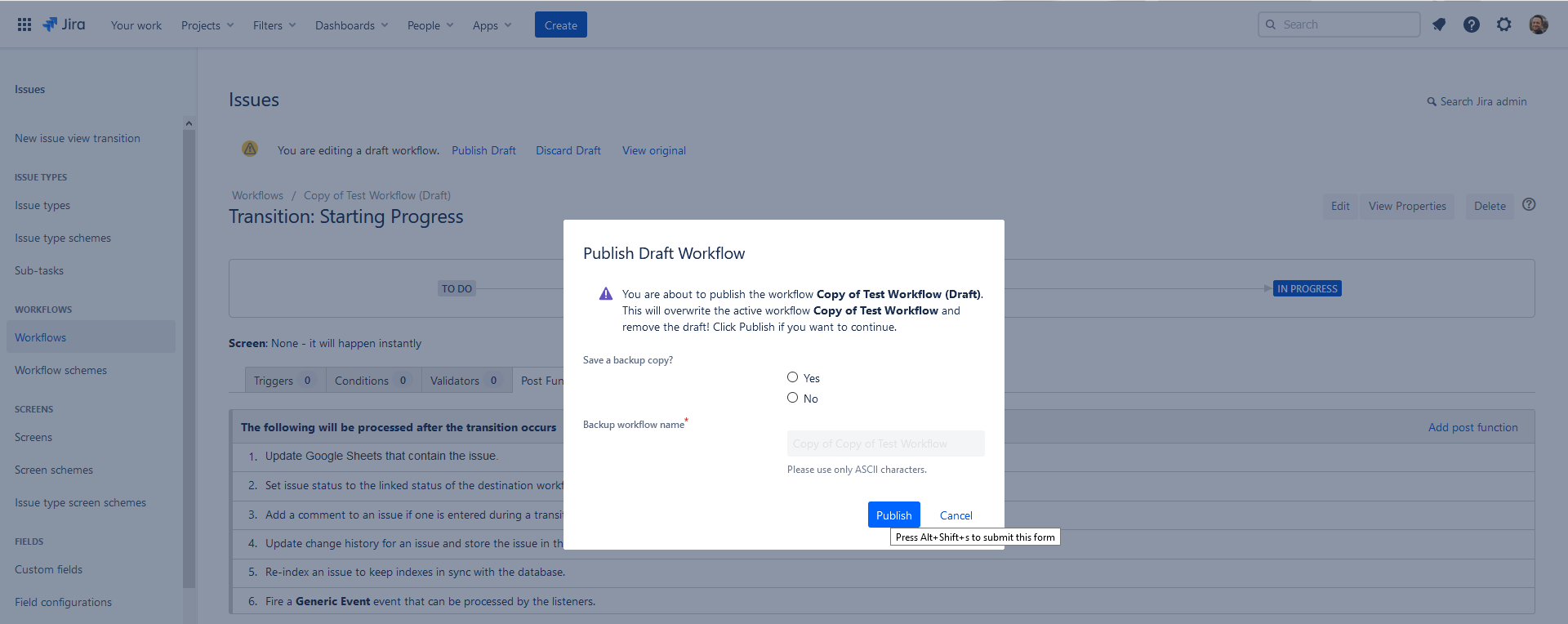 Complete the optional workflow backup steps and click Publish to finish your changes.