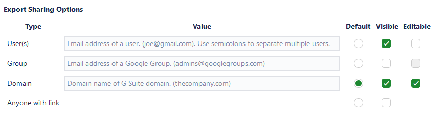 This section allows an administrator to define Google Drive folders and Google Shared Drive folders where users can store their exports. If this section is not configured, all exports will be stored your in Service Account's default location, if the Service Account has storage available. Service Accounts created after April 15, 2025 are not given any storage and must use Shared Drives and folders. To define which folders users may store their exports in, perform the steps below.