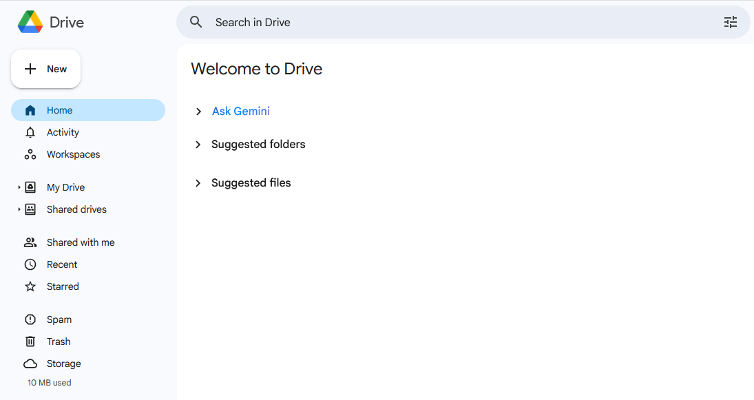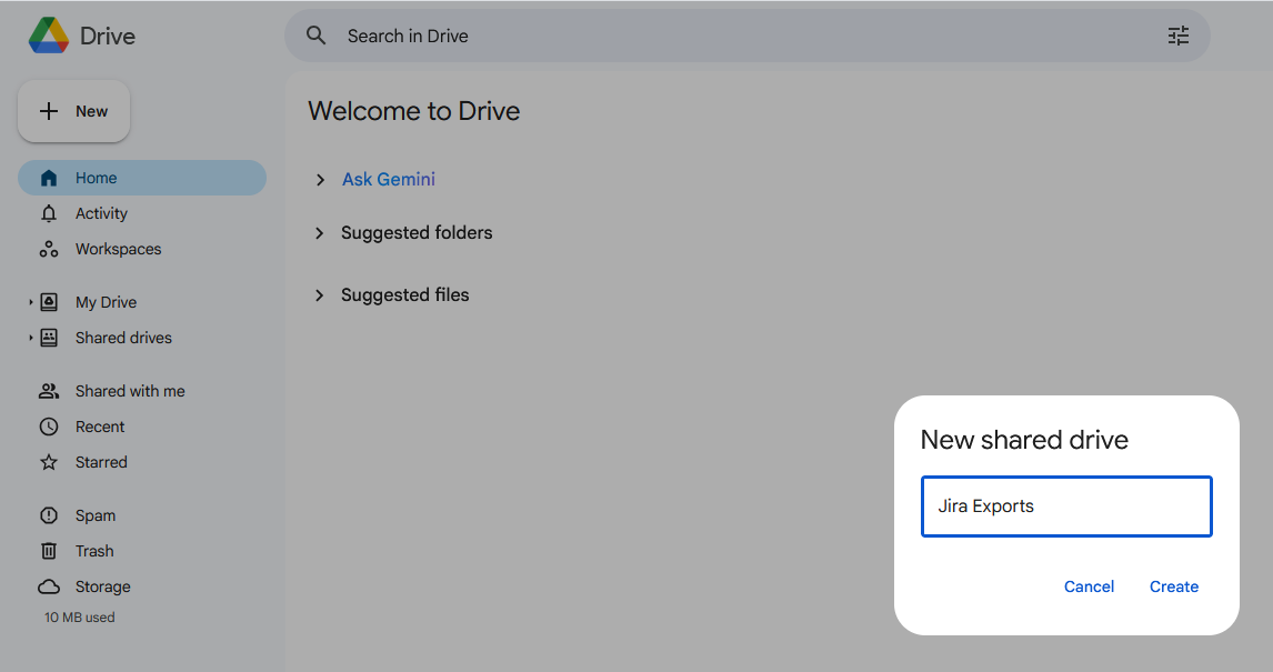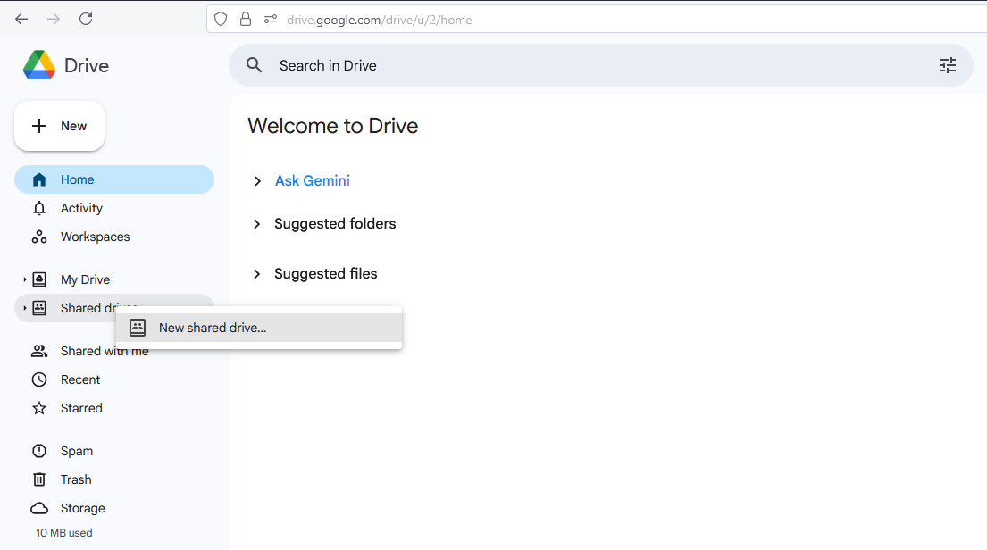 This step is only necessary if you are using a new Service Account created after April 15, 2025. Service Accounts created after this date are not given any storage by Google, and must use Shared Drives instead. If you are using an older Service Account, or have already created a shared drive for your Service Account to use, skip to the Create Folders step.