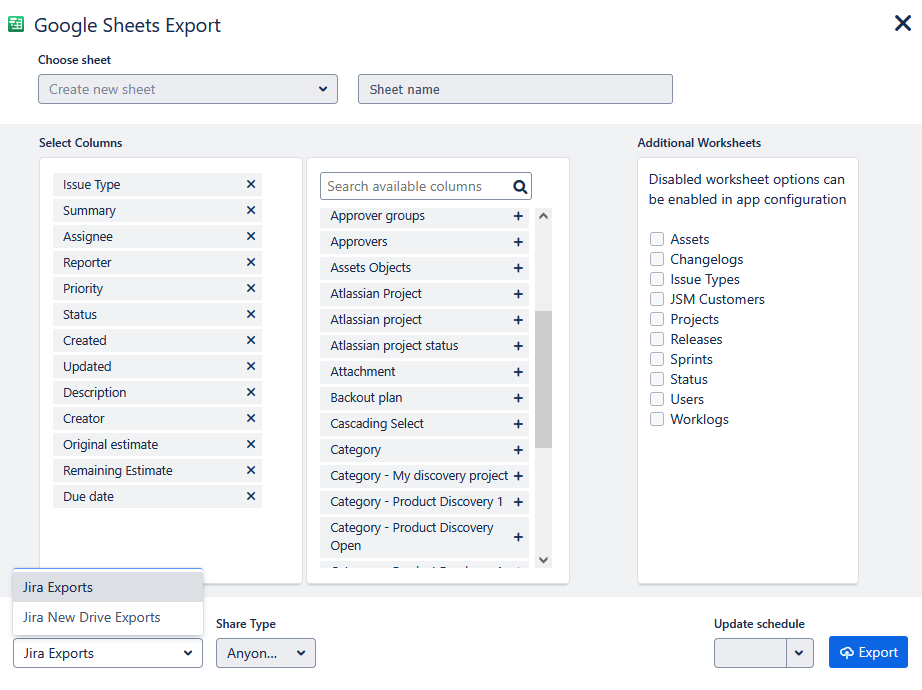 This section allows an administrator to set a limit on the number of issues that can be exported to a single sheet. Since larger sheets take more time and resources to generate and update, limiting the number of issues in the sheets can help improve performance. The default limit matches your Jira instance's setting (jira.search.views.max.limit in Jira Server or Data Center, or 1,000 in Jira Cloud). To allow an unlimited number of issues, set this value to -1. Any limit set here applies to all exports created by the add-on.