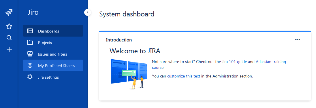 Jira Cloud users: To access the My Published Sheets screen, click on the My Published Sheets item on the System dashboard screen in Jira.