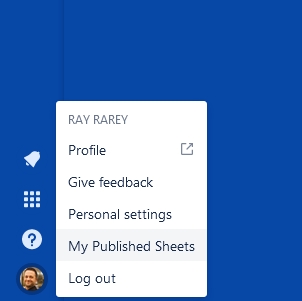 Alternatively, you can click on the My Published Sheets item in your user profile menu from the bottom left in Jira.