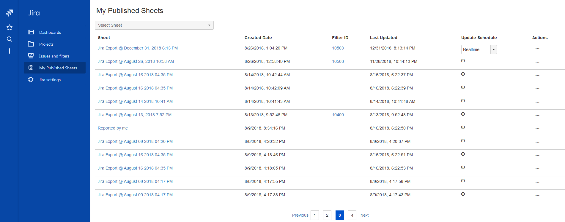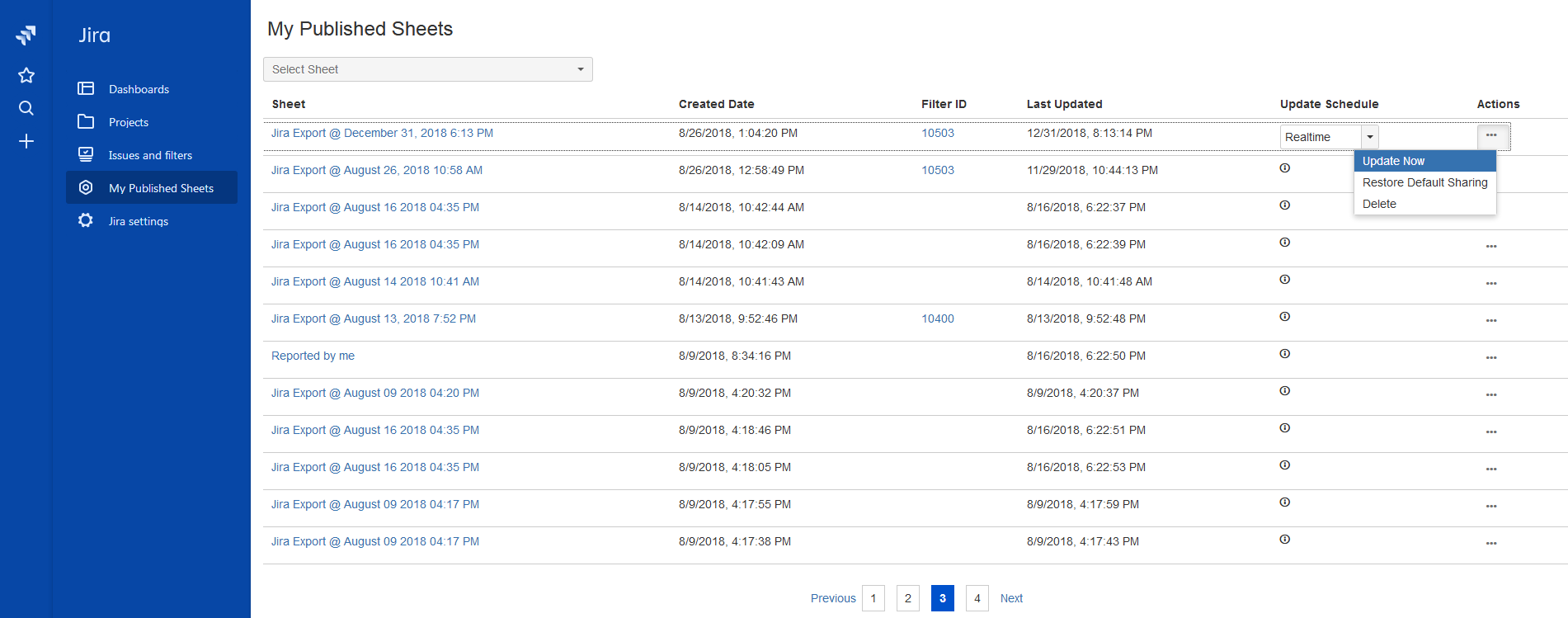 From the My Published Sheets screen, Jira users can perform the following actions on the sheets: