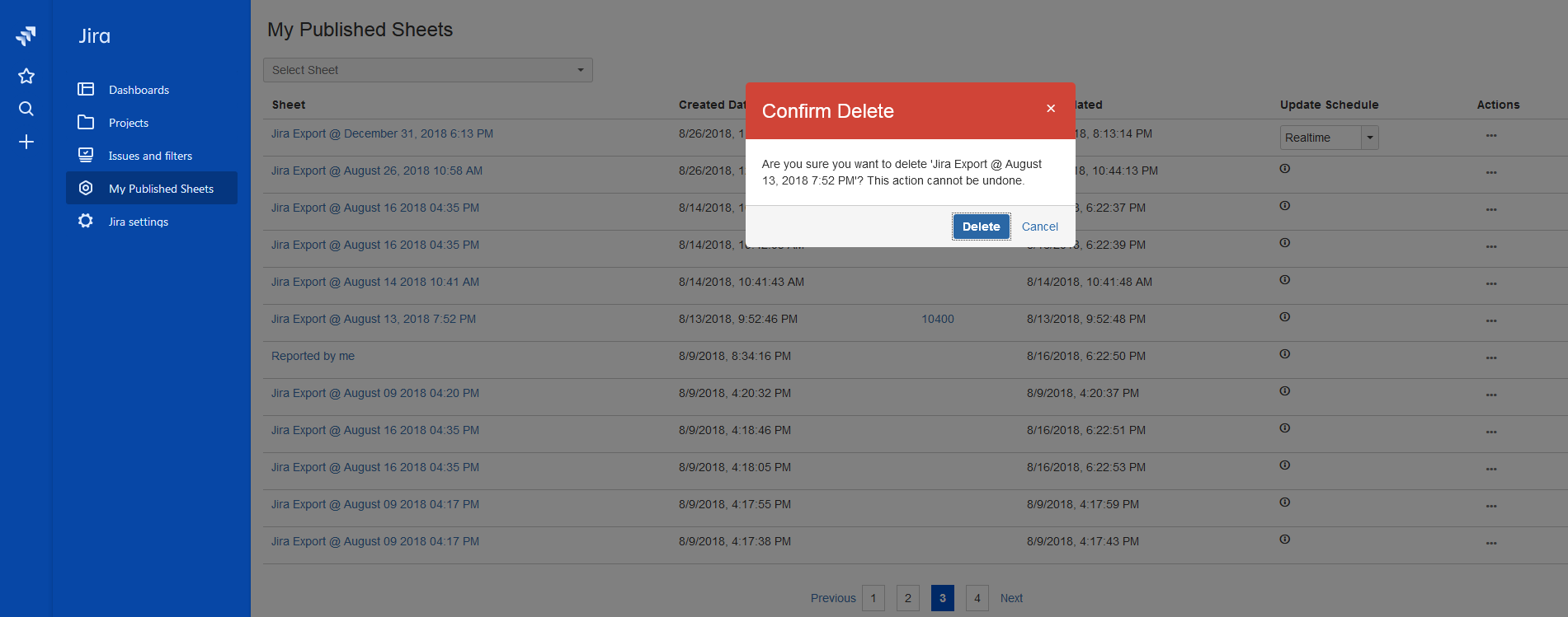 Since a sheet may be stored in a location not easily accessible from Google Drive, the My Published Sheets screen allows a Jira user to easily delete a sheet. Simply click the Actions button for the sheet you wish to remove, then choose Delete from the Actions menu, and confirm your request. Deleted sheets cannot be recovered, so be absolutely sure you want to delete the sheet before continuing.