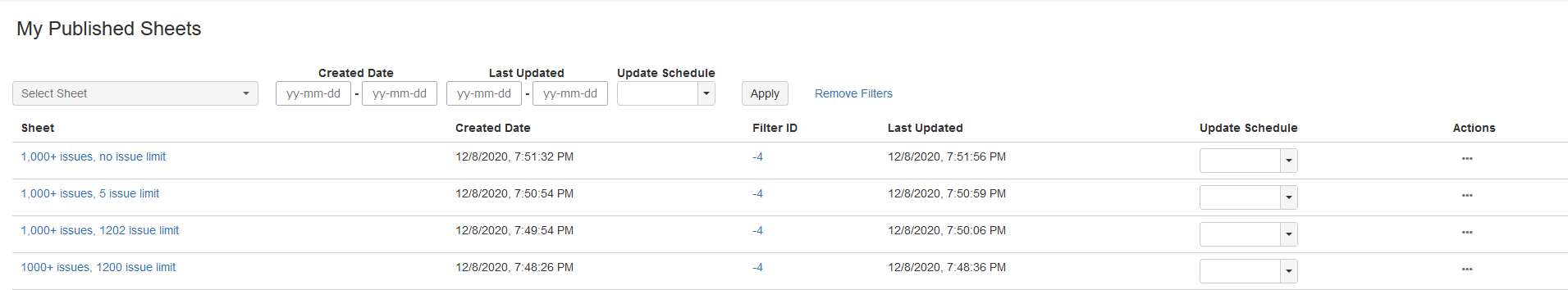 For the Update Schedule filter, select None for sheets that do not have an update schedule set (manual update sheets). Leaving the selection empty ignores the sheet's update schedule when filtering.
