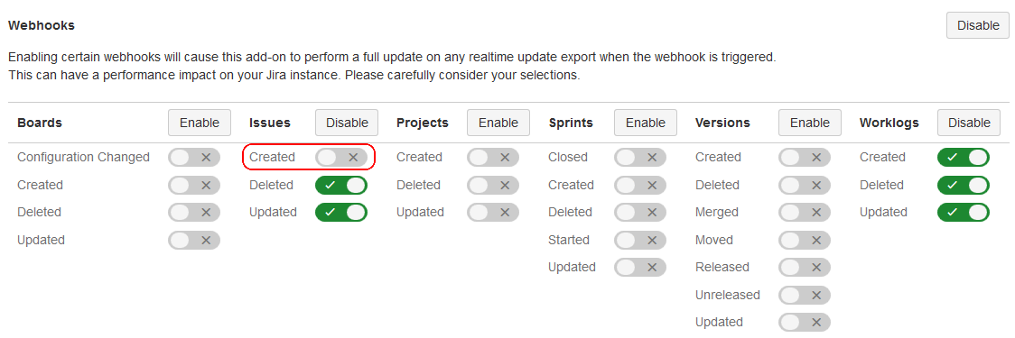 If you notice that your realtime update-enabled Google Sheet contains two rows for each newly-created Jira issue, it may be because another third-party add-on is editing issues immediately after they are created. The solution to this problem is to disable the "Issue Created" webhook in the Google Sheets Integration Configuration screen: