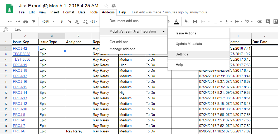 This page will guide you through the initial setup of the Google add-on, as well as how to use it to update your Jira issues and perform other Jira tasks from Google Sheets.