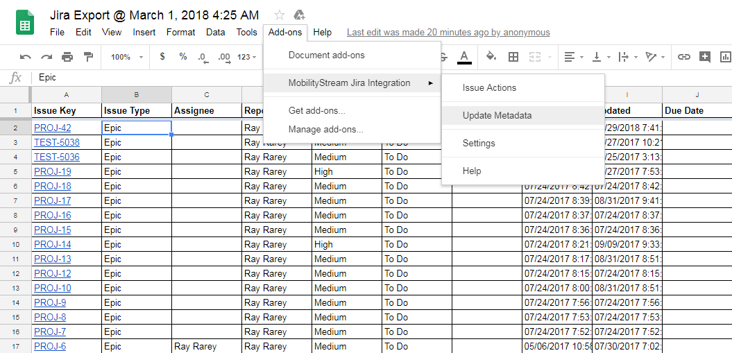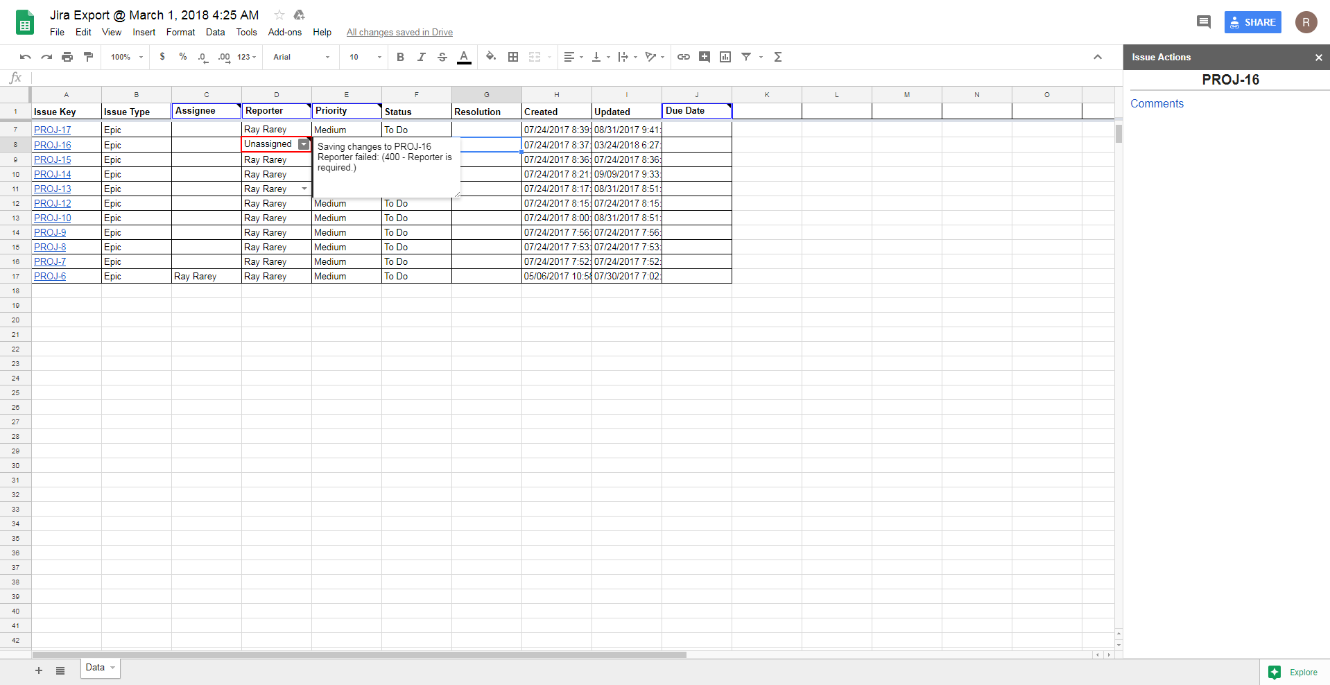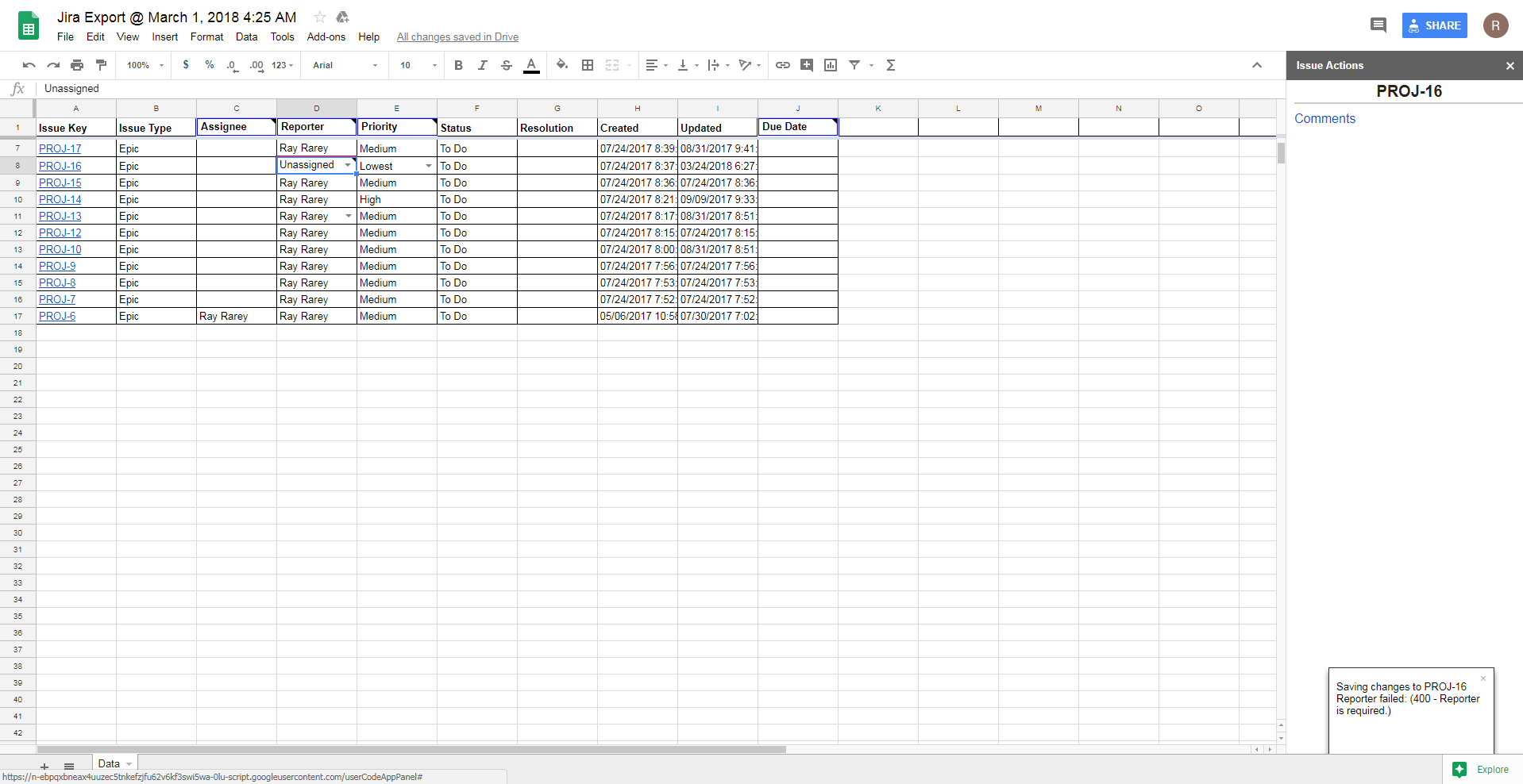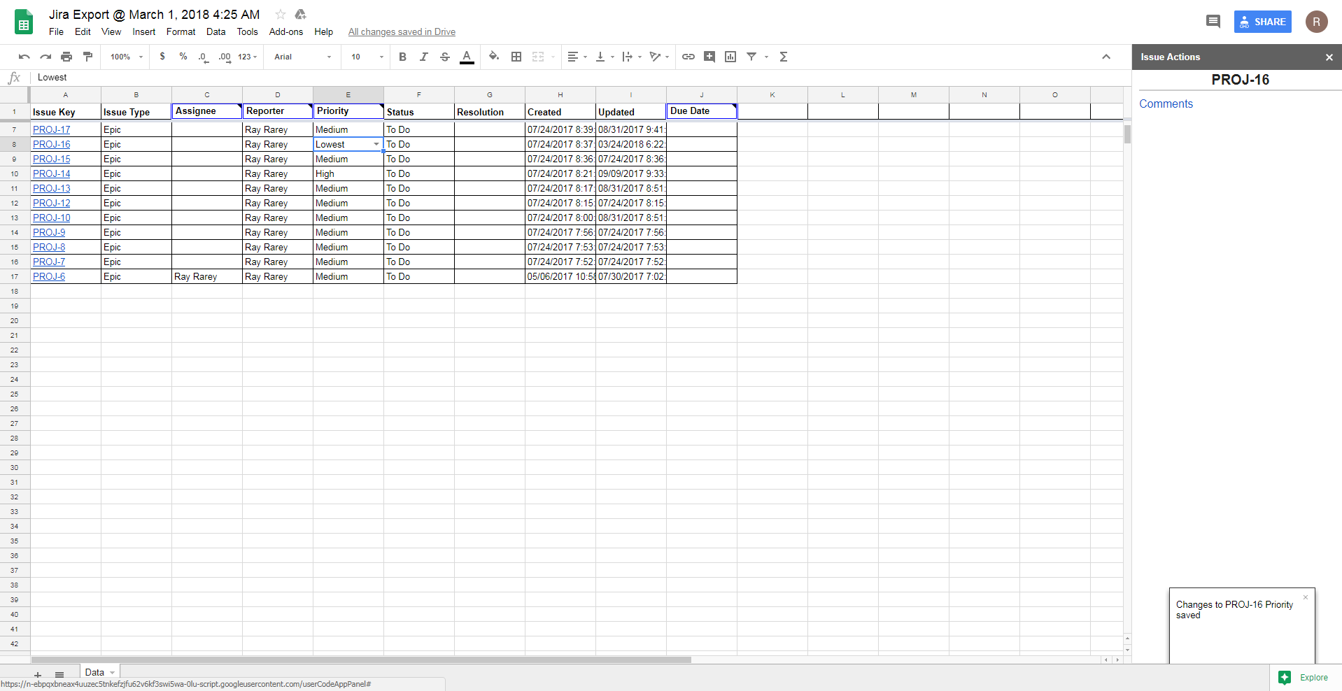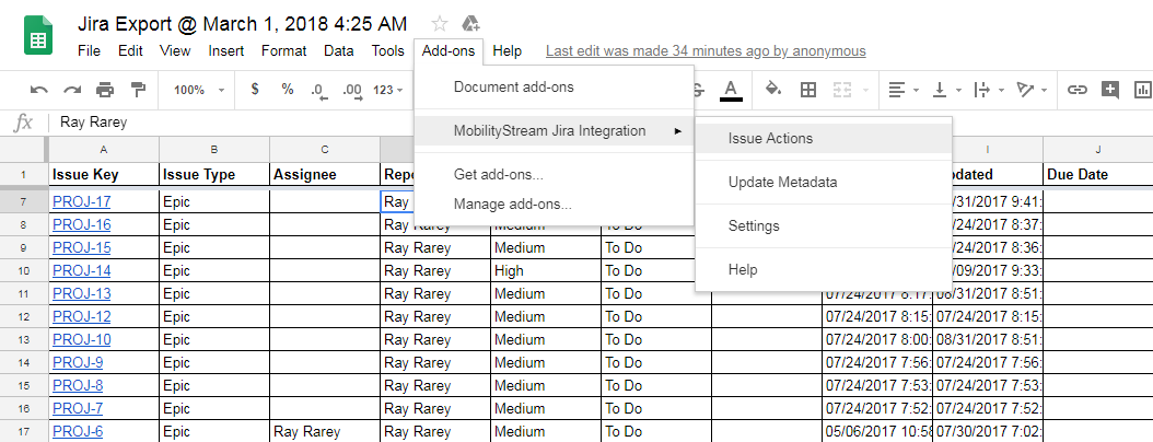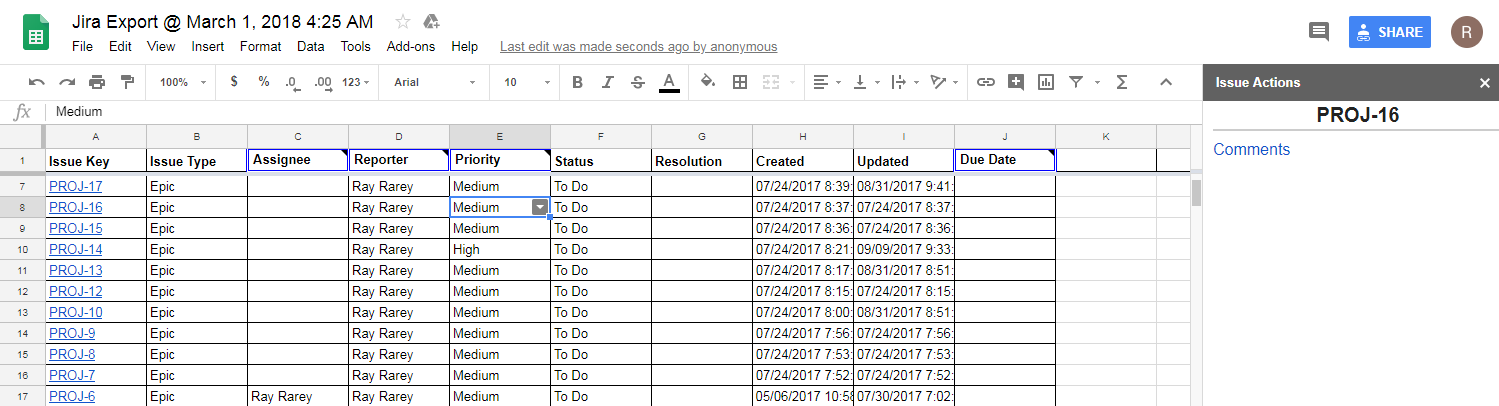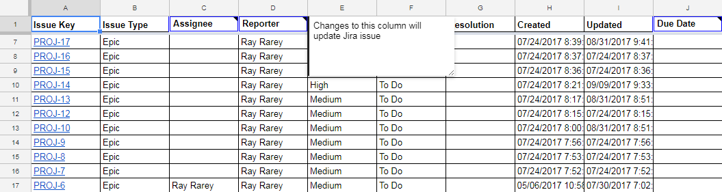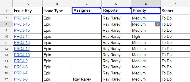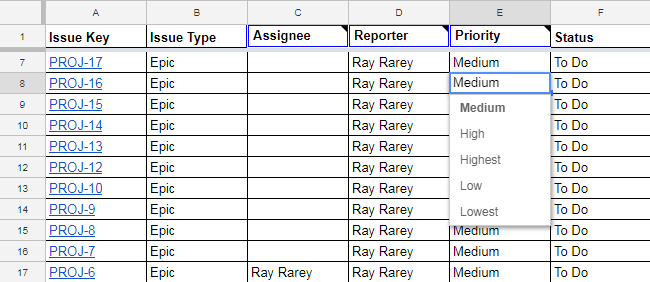 After focus is placed in a spreadsheet cell, you can change the cell's value and if it is for a field that syncs back to Jira, your change will sync back to Jira after you finish editing the cell. Certain cells that are single-select fields in Jira, such as Assignee, Reporter, and Priority, will change to single-select drop downs in Google Sheets after you place your cursor in them. This change can take up to 1 second, so please be patient and wait for the drop down indicator arrow to appear. Other cells that are multi-select or require searches, such as Labels, Affects Version, or Picker Custom Fields, will display an input field in the Issue Actions sidebar to edit the value(s).