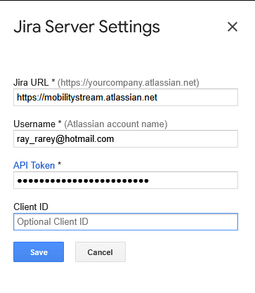Jira Cloud users: Atlassian no longer accepts username & password-based authentication for scripts or processes accessing Jira Cloud APIs. You will need to create an API Token to use this add-on. Please see the Atlassian API Token documentation for API Token creation instructions. The API Token you create will be used in place of your Jira password when authenticating in the Google add-on.