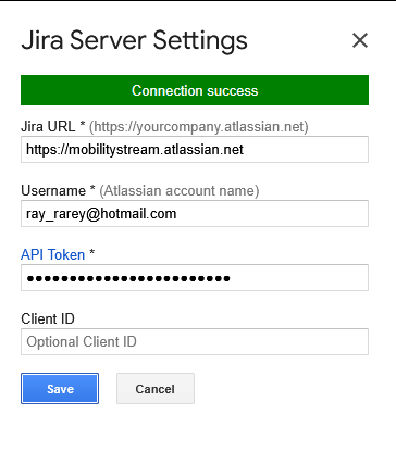 When finished, press the Save button. The add-on will attempt to connect to Jira using the information you provided, and you will be presented with either a success or failure message in the dialog.