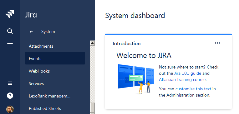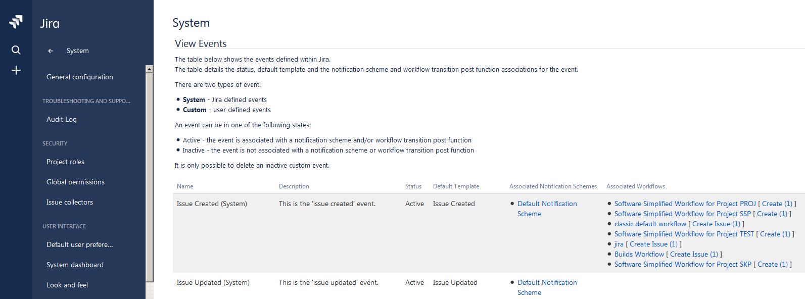 While the add-on's webhooks may be configured properly, that does not guarantee that your Jira instance is firing the events that the webhooks will process. Jira's events and their notification schemes are configurable and it is possible that your Jira instance is not firing certain events. To check your Jira instance's event configuration, navigate to System Settings in Jira and find the Events item under the Advanced header. Click on the Events item and review your event configuration.