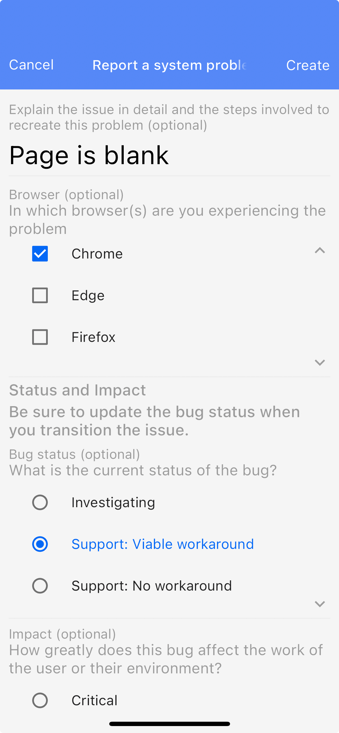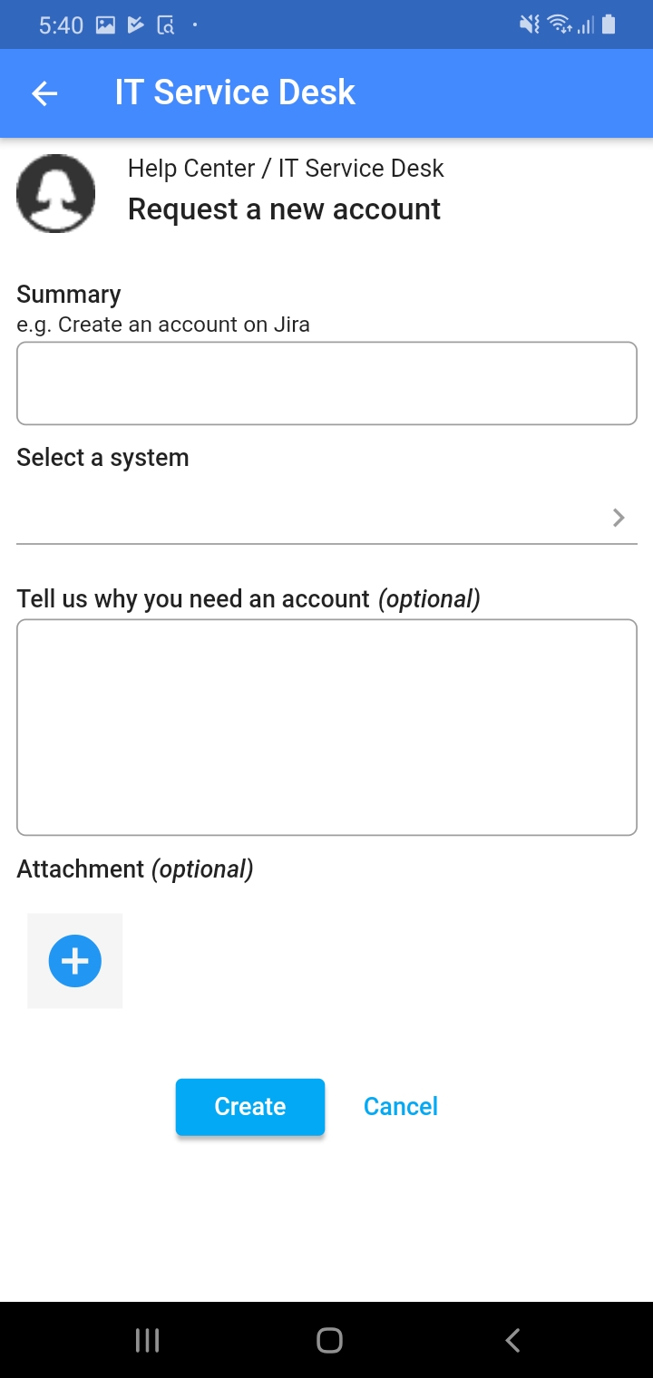 Optionally you can attach a file to the request ticket by pressing the + button. We support a variety of different files such as images, videos, audio files, etc. After filling out all the required fields, press the Create button or hit Cancel if you want to stop. Your request will be generated in a Service Desk agent’s support queue.
