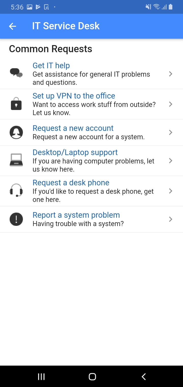Choose your Service Desk if you have access to more than one Service Desks at your organization. Alternatively, you can directly search for Request types across multiple Service Desks on the Help Center screen.