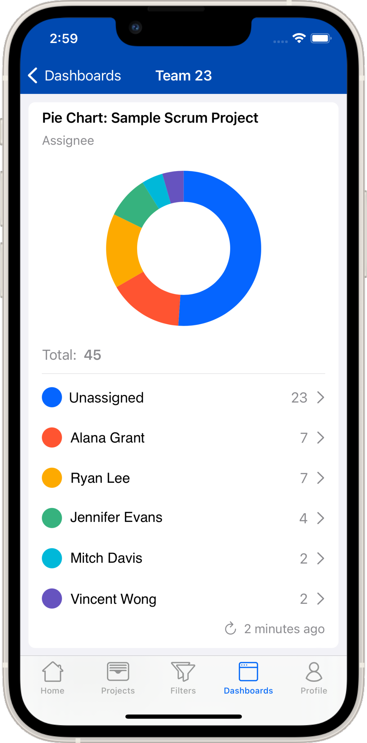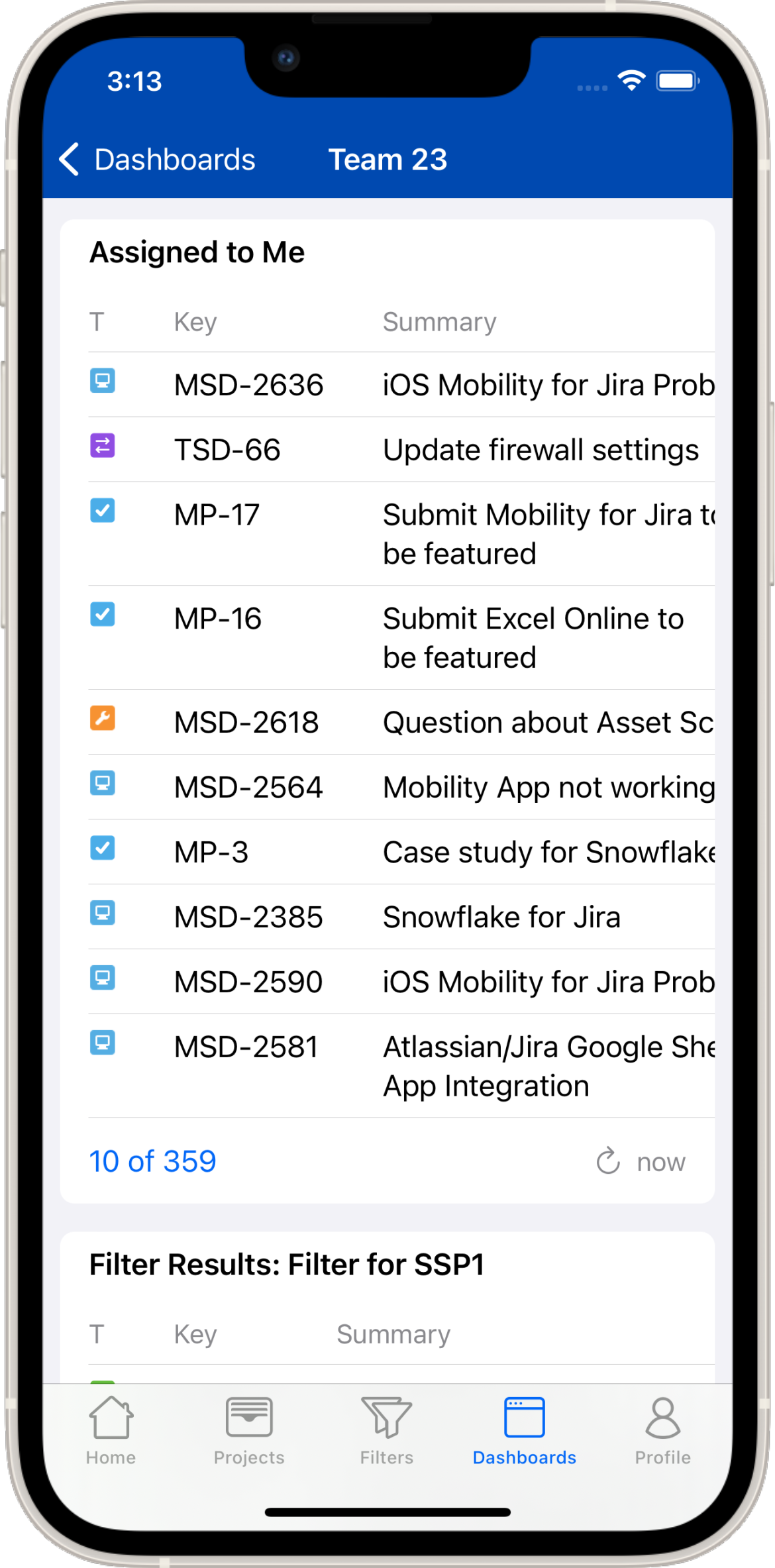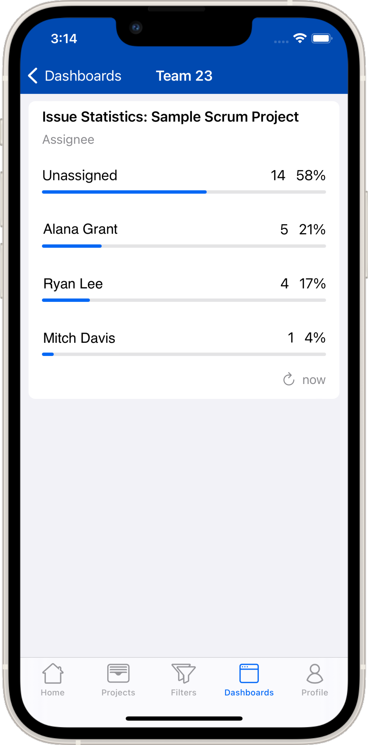 A dashboard consists usually of several gadgets which you can assemble in Jira itself. A gadget may contain additional links. Links to Jira issues are clickable and the issue will be displayed in Mobility for Jira. Also some diagrams will allow you to tap a section that will bring up a list of Jira issues.