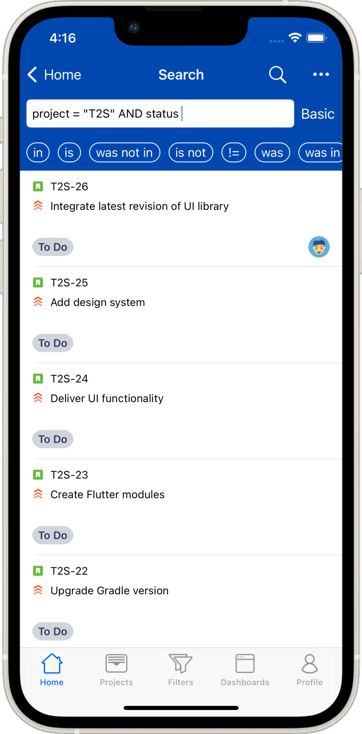 To find issues using advanced search (JQL), press the Advanced text link to the right of the search bar text field. You can start typing JQL. The app has a type-a-head/autocomplete feature that allows you to select an option without fully typing it. After typing a few characters you will see options appearing on the bottom of the search bar text field. Select one of the options and the JQL portion will be populated in the search bar.