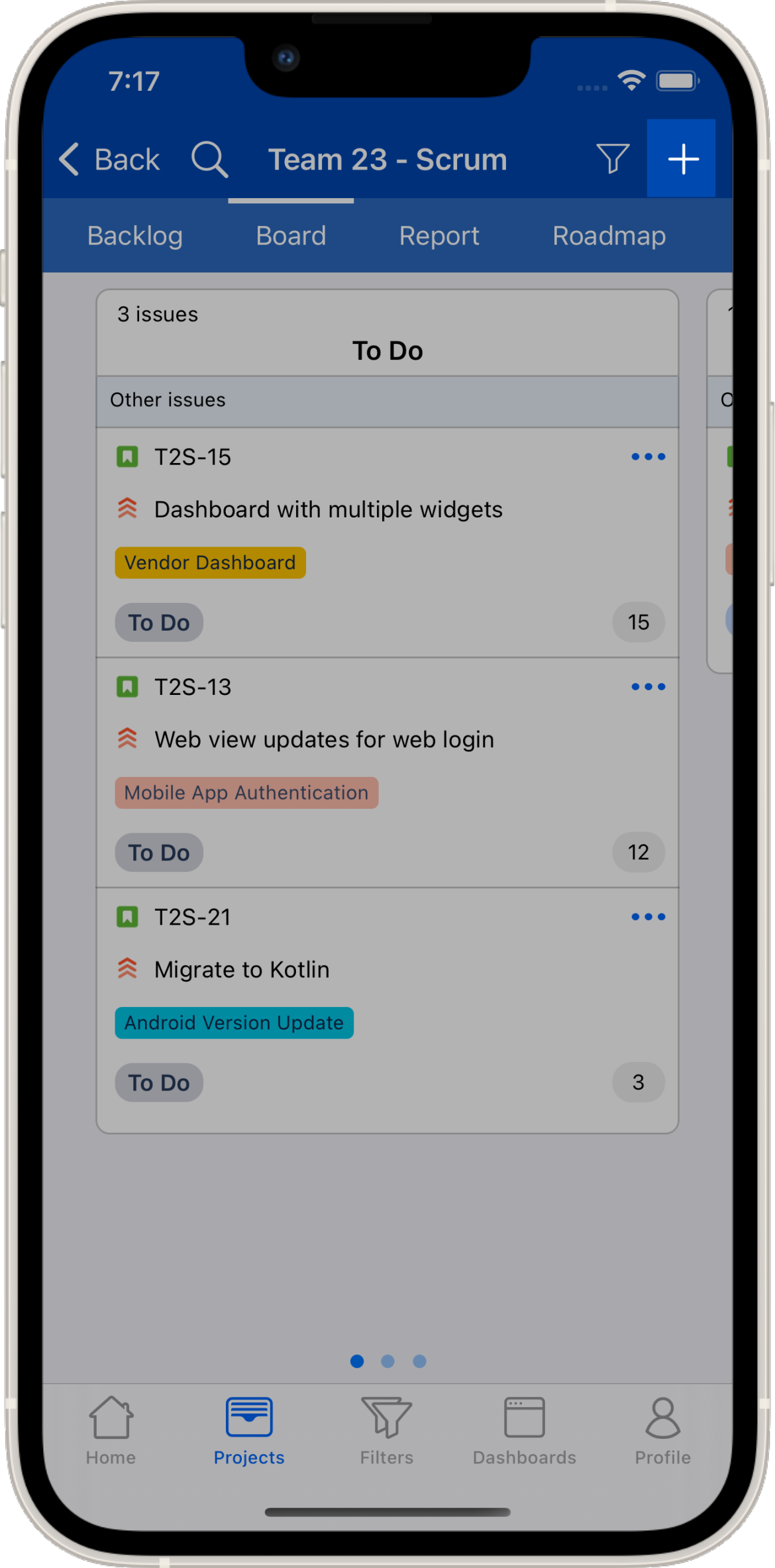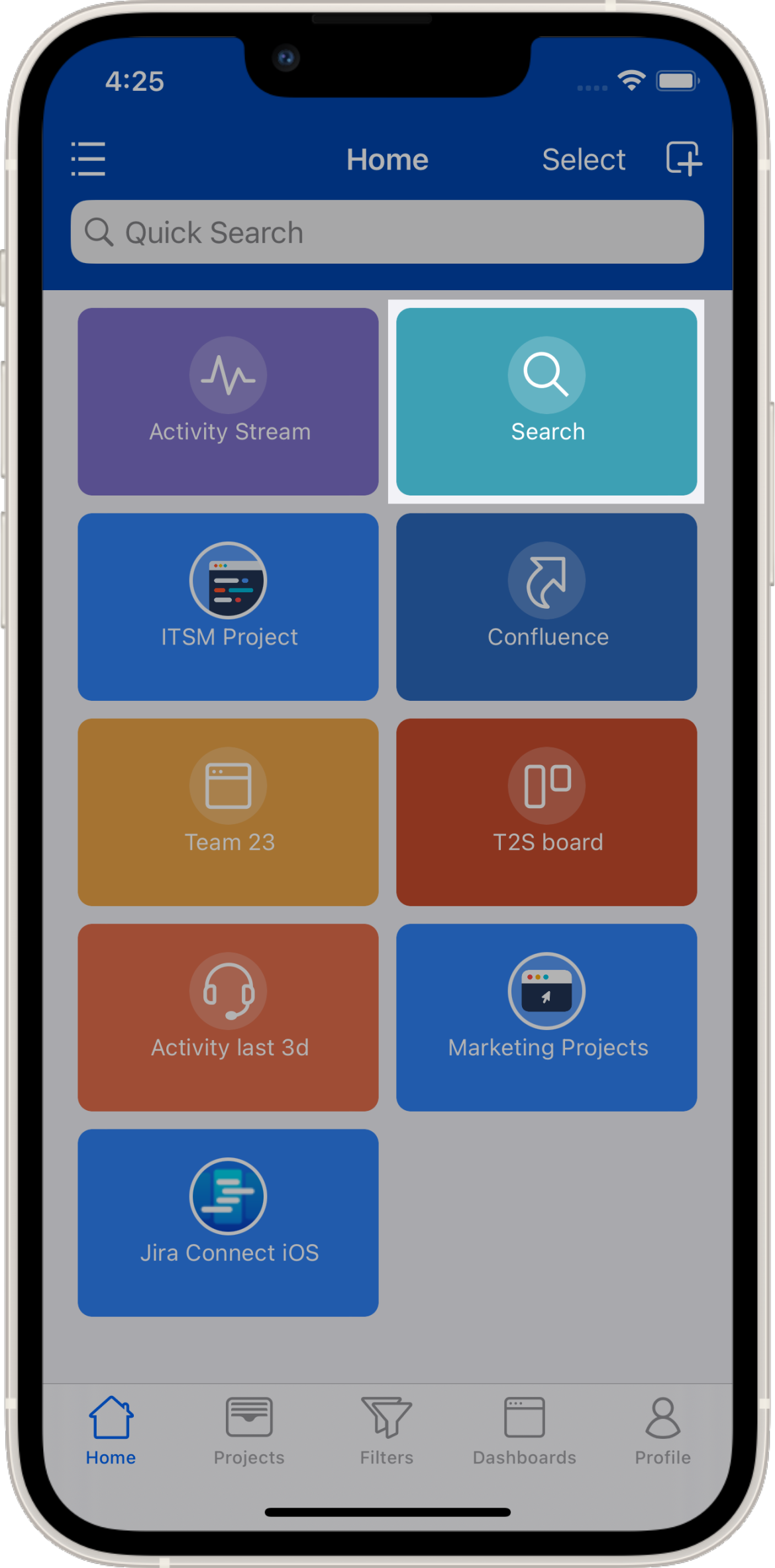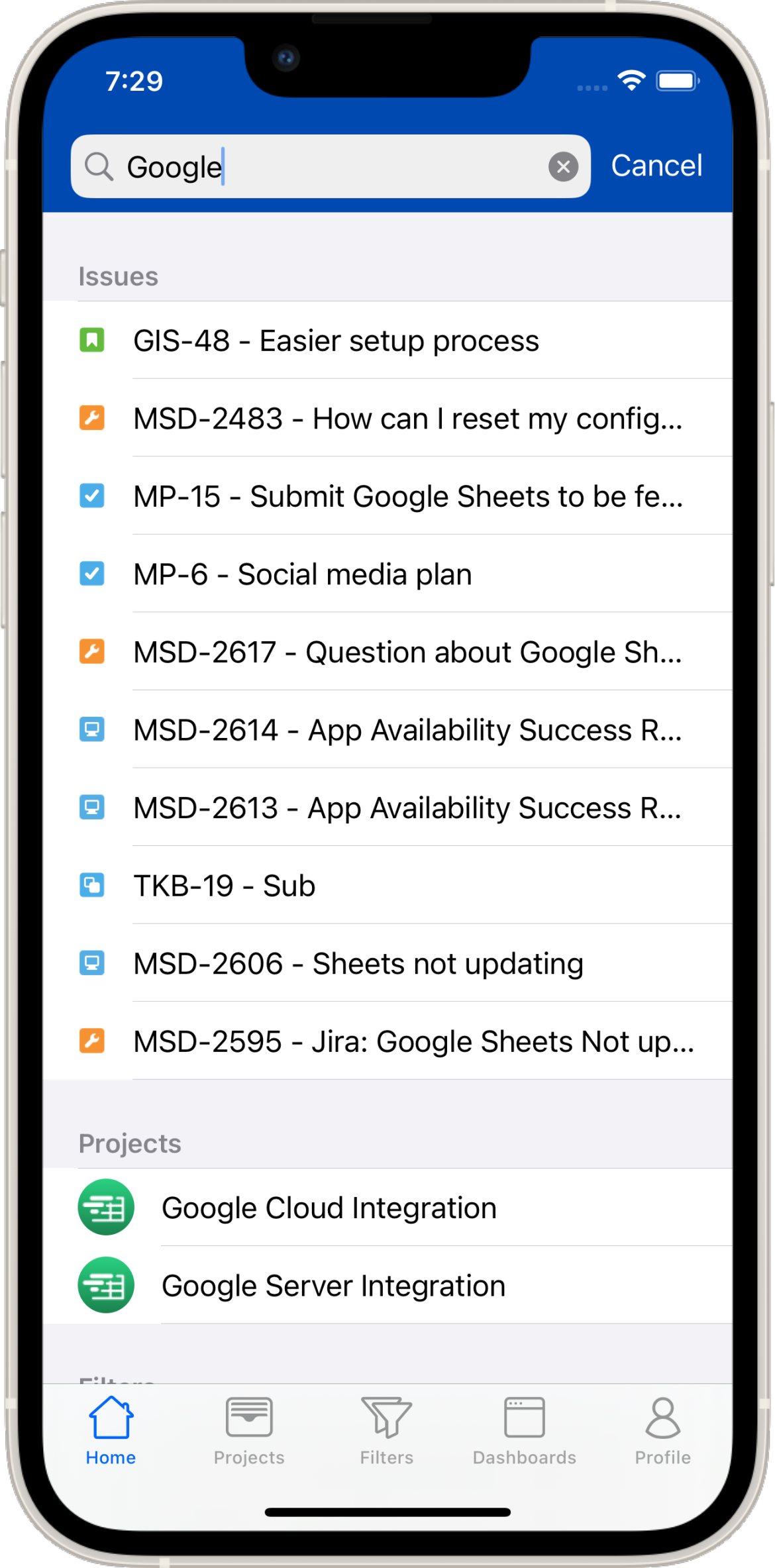 If you know part of the issue key or a keyword you can simply go to your home screen and enter it in the top search bar (Android: you will need to press the magnifying glass icon first). The Mobility app will display a matching list of issues, projects, dashboard, and filters. If your Jira instance is large you may want to be more specific to create the result needed.