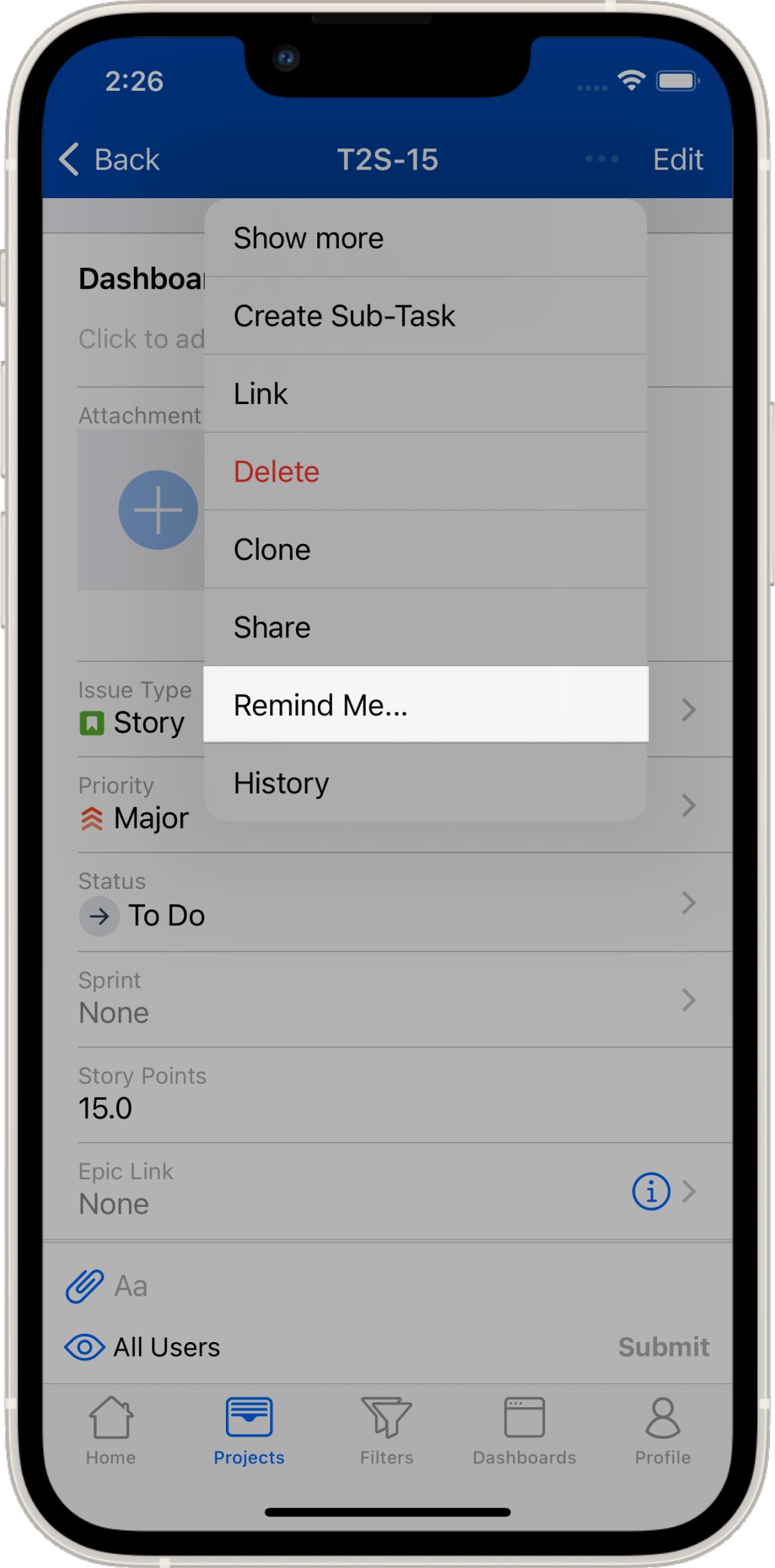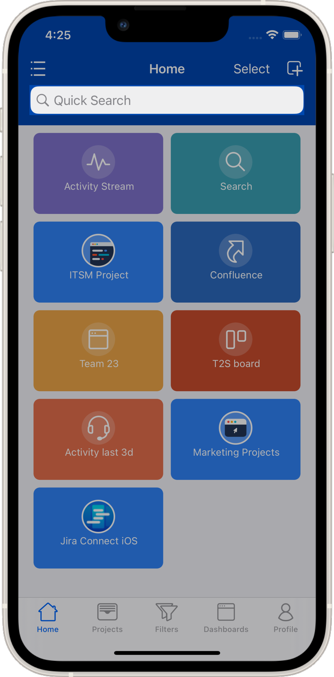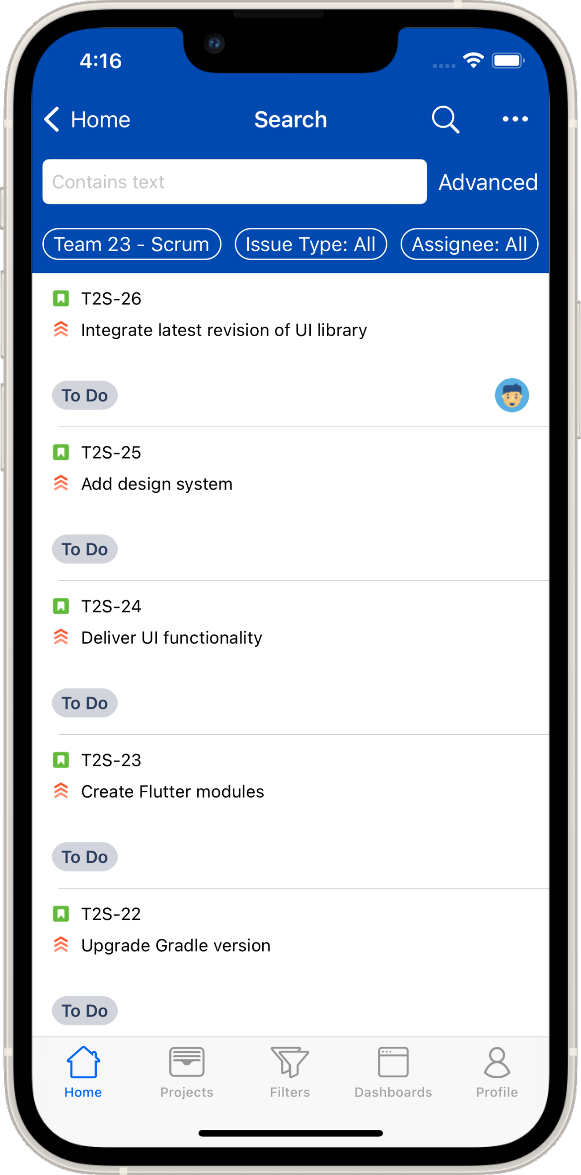 If you know part of the issue key or a keyword you can simply go to your home screen and enter it in the top search bar (Android: you will need to press the magnifying glass icon first). The Mobility app will display a matching list of issues, projects, dashboard, and filters. If your Jira instance is large you may want to be more specific to create the result needed.